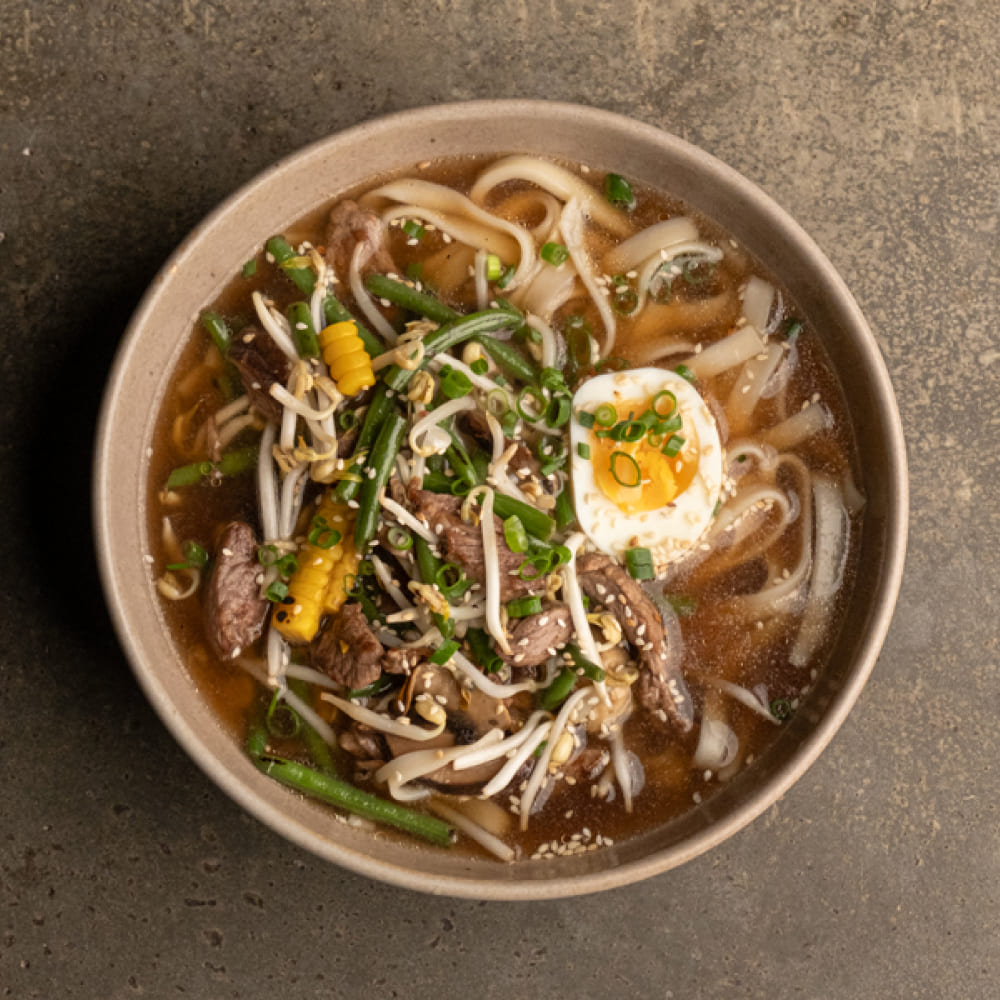 Наваристый говяжий бульон с соусом чёрный перец. Пшеничная лапша (удон) с миксом из овощей (кукуруза, стручковая фасоль, ростки сои), грибами шиитаке и шампиньонами, яйцом, зеленым луком, кунжутом и кунжутным маслом.