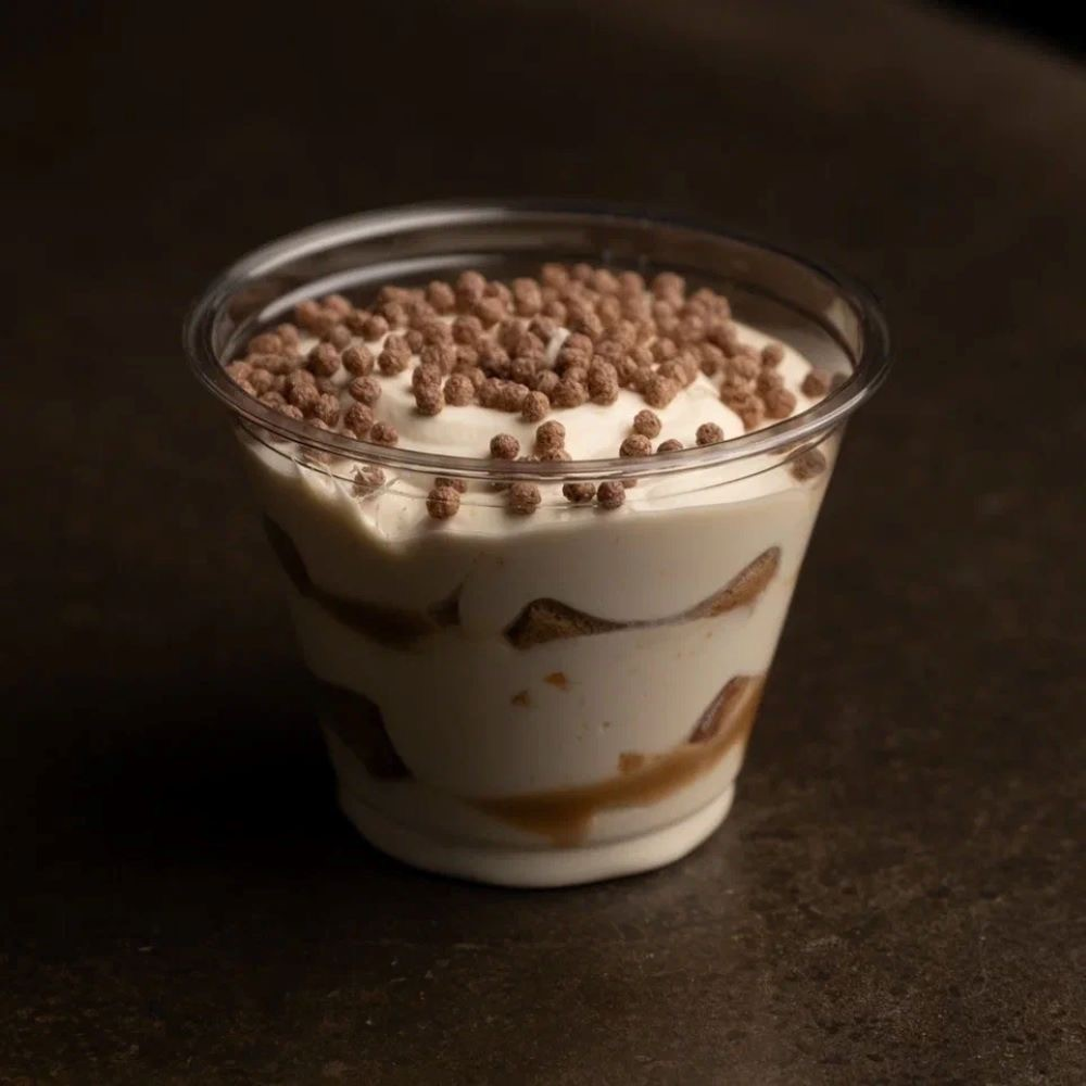 Крем на основе (креметта, мисо пасты, сливок), мисо карамель, савоярди, рисовые шарики