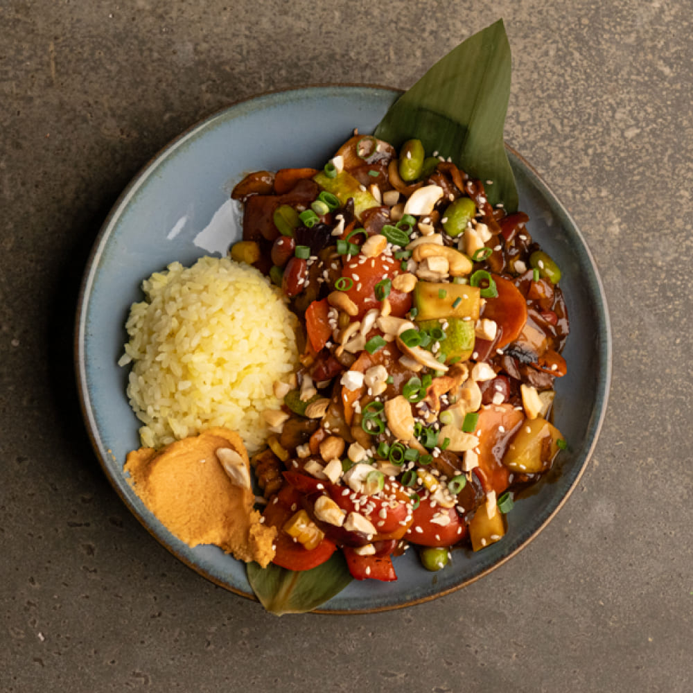 Овощи (цукини, перец болгарский, морковь, бобы эдамаме, фасоль красная, красная фасоль, красный лук) с грибами шиитаке и шампиньонами обжаренные в соусе пад Тай (кисло-сладком). Шарик риса, паста карри, кешью и зеленым луком