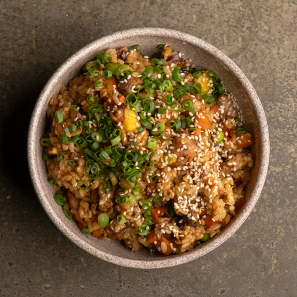Пряный рис обжаренный с филе грудки и миксом из овощей (лук, морковь, цукини, болгарский перец, кукуруза, эдамаме), омлетом, грибами шиитаке, шампиньонами в устричном соусе. Кунжут, зеленый лук
