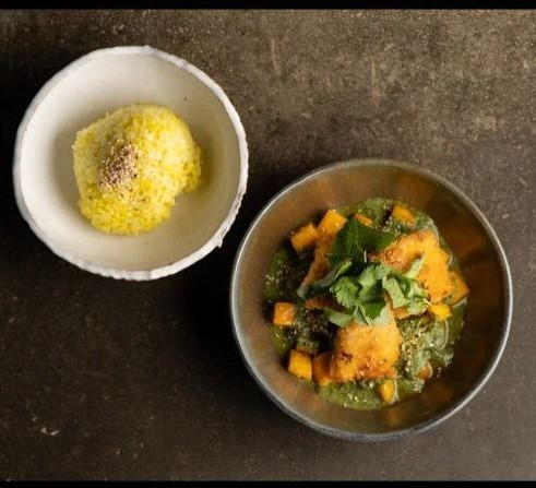 Томленная тыква в зеленом карри с мятой, шпинатом и базиликом, хрустящий судок в кляре с кинзой, кунжутом, бобовой чили пастой и шариком риса
