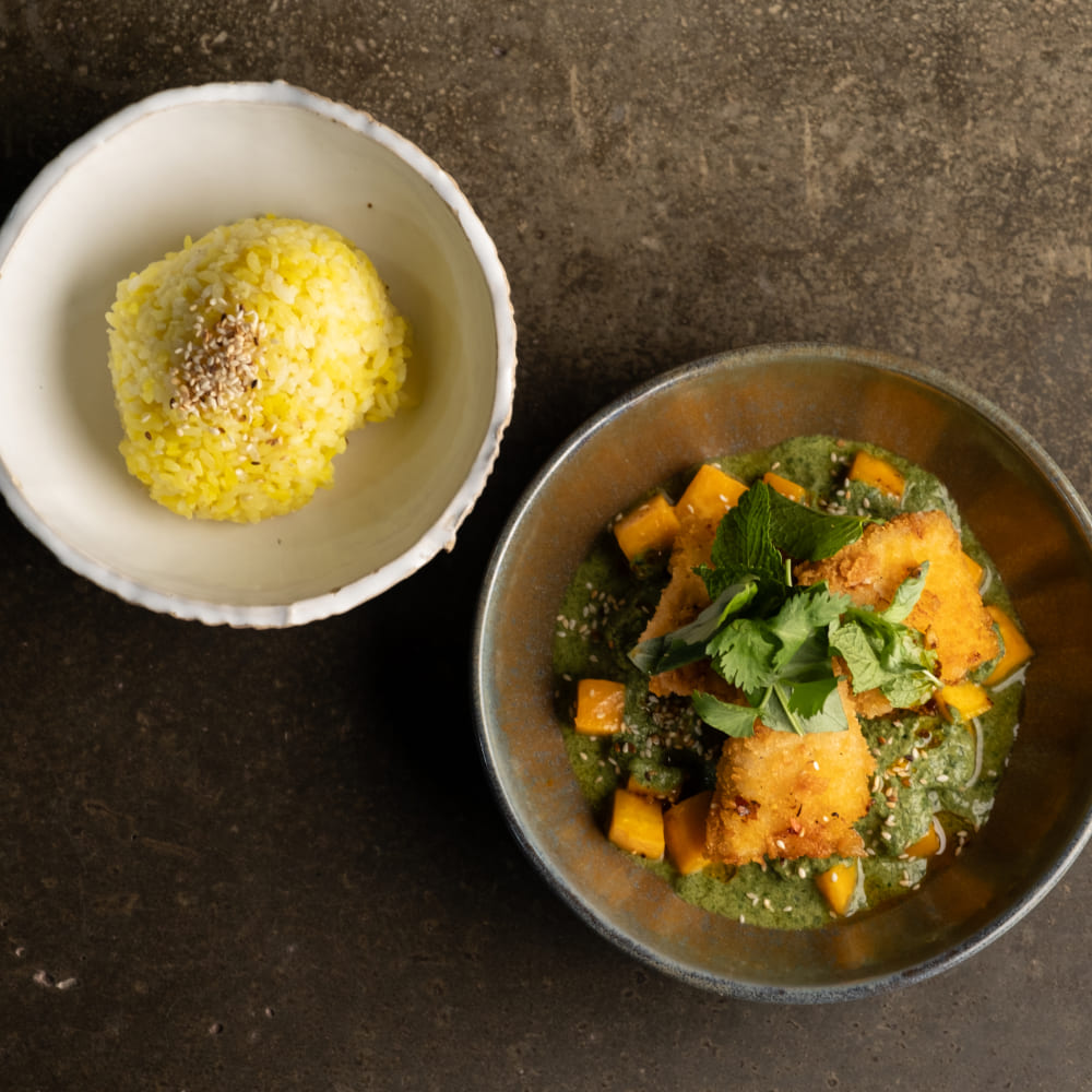 Томленная тыква в зеленом карри с мятой, шпинатом и базиликом, хрустящий судок в кляре с кинзой, кунжутом, бобовой чили пастой и шариком риса 300гр./150гр.